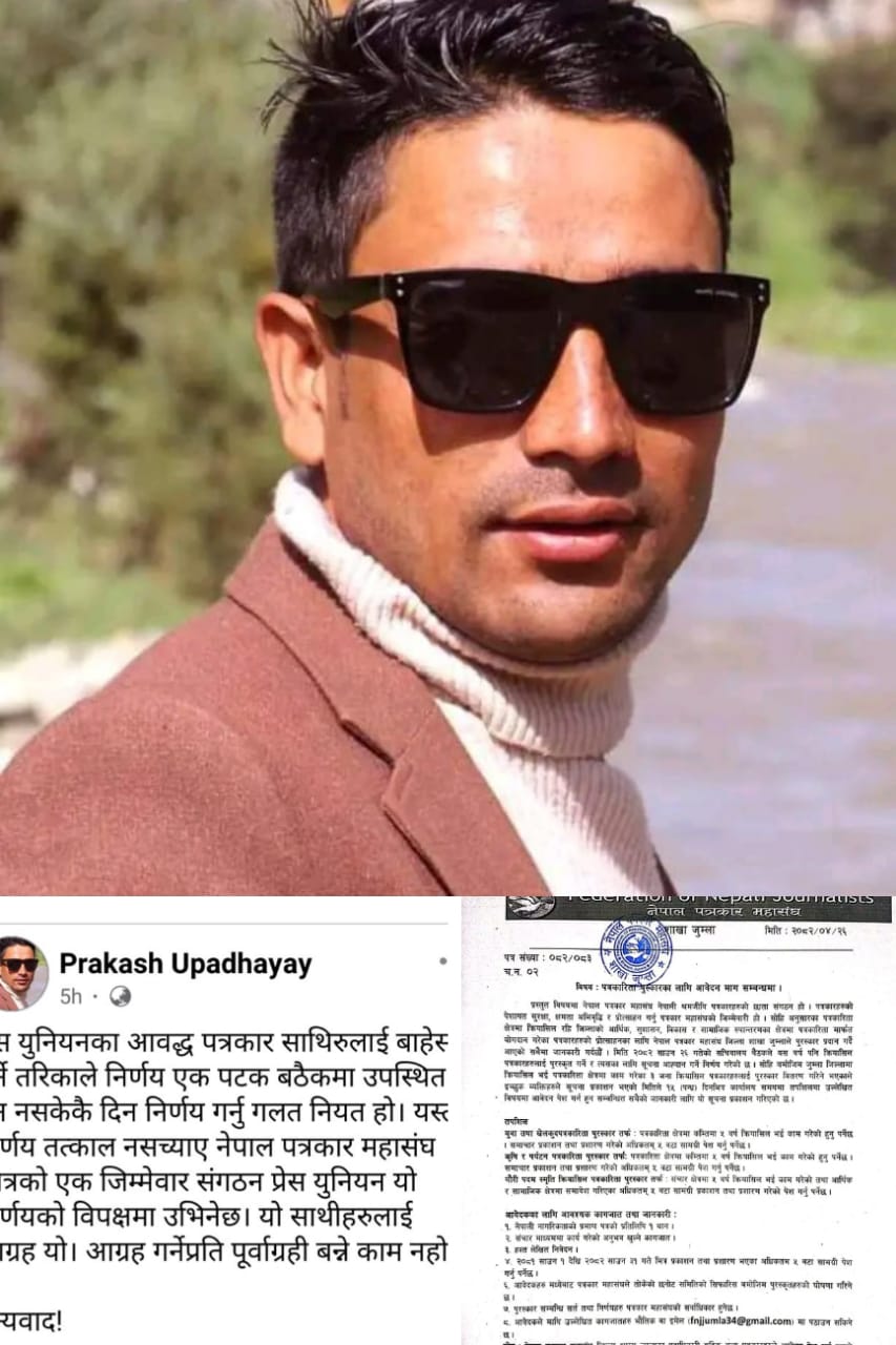 जुम्ला नेपाल प्रेस युनियन जुम्लाका अध्यक्ष तथा नेपाल पत्रकार महासंघ जुम्लाका सचिव प्रकाश उपाध्यायले महासंघकै तर्फबाट गरिएको एक निर्णयप्रति सार्वजनिक रूपमा असन्तुष्टि जनाएका छन्।
